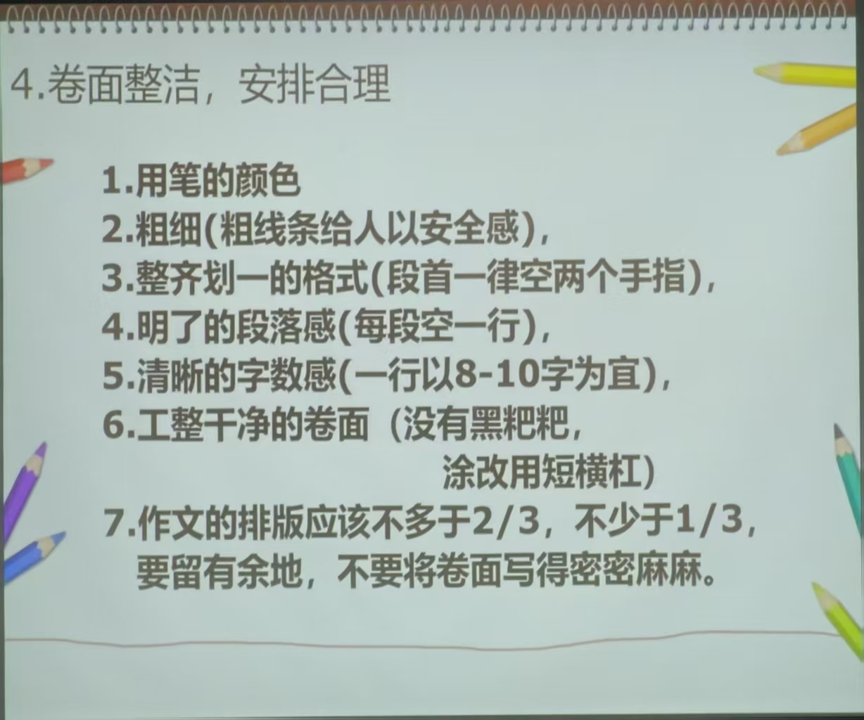 在讲解过程中,主讲老师强调提升写作能力需掌握两大要点:一是要积累优质表达,锻炼灵活运用与同义替换能力,进而丰富语言层次;二是要学会提炼核心立意,根据主题关键词筛选适配素材,据此剔除冗余内容、聚焦写作重点。同时,老师着重提醒了卷面字迹工整的重要性。