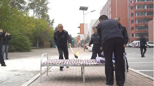 学生两人一组轮流实操,用被子覆盖火源,亲身掌握初期火灾处置技巧。