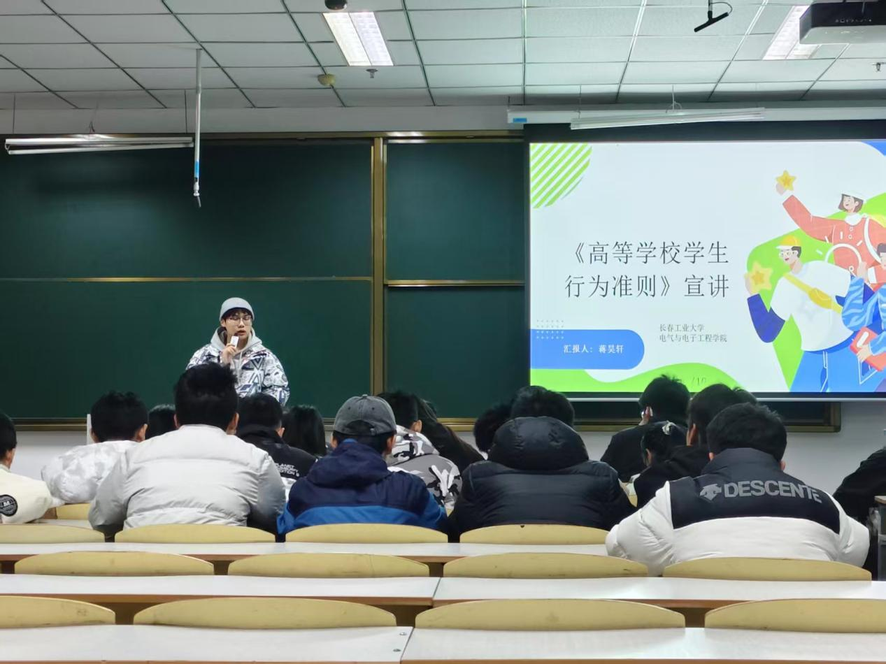 本网讯(通讯员 李柯欣) 为引导学生树立正确价值观,规范日常行为举止,营造优良学风校风,12月10日长春工业大学电气与电子工程学院于教学科研楼2609教室组织开展了《高等学校学生行为准则》专题宣讲活动。