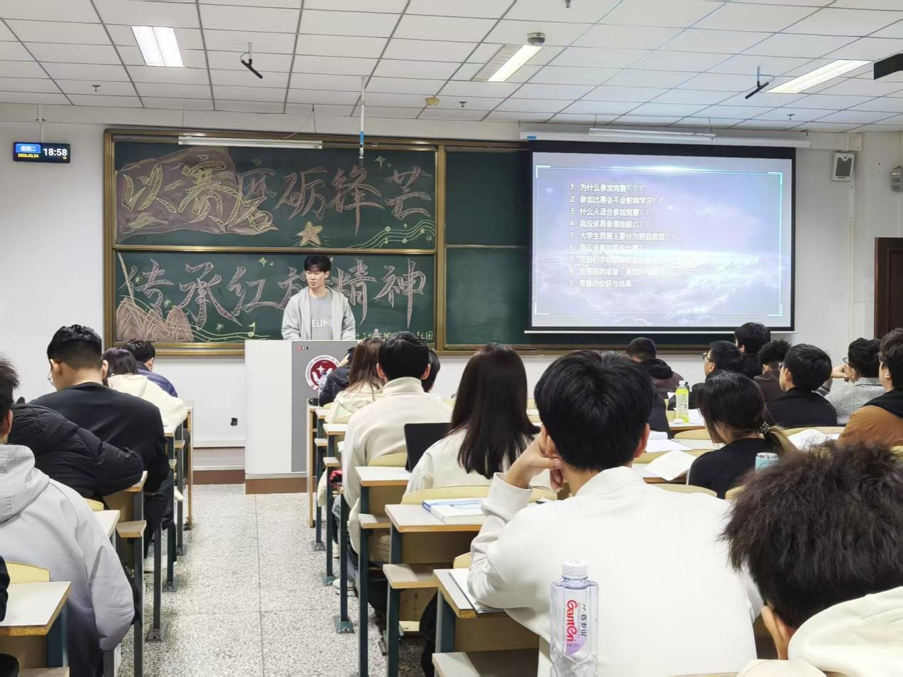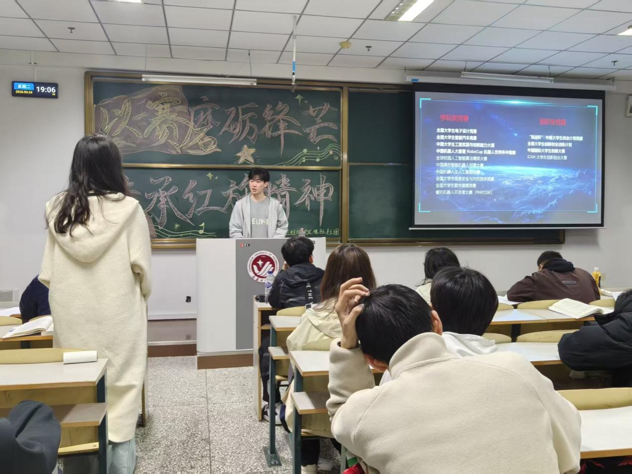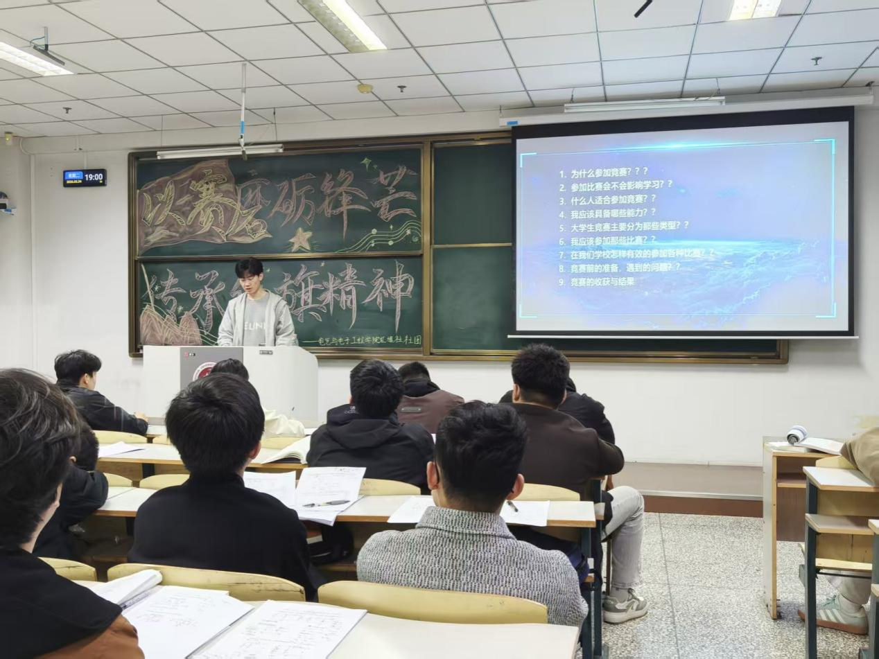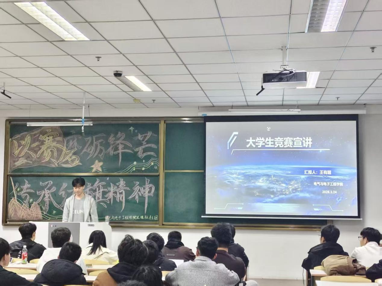 本网讯 (通讯员 卢佳雪 李柯欣)为帮助同学们明晰竞赛选择、掌握参赛方法,拓宽学术实践路径,提升综合竞争力,3月24日,电气与电子工程学院于教学科研楼2311举办“以赛磨砺锋芒,传承红旗精神”主题宣讲活动。 红旗社成员王有超向同学们分享了竞赛相关经验与学习成长体会。