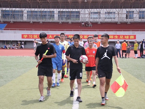 在学院院长李元春开球后,比赛正式开始,一颗小小的足球前,展开了一次又一次激烈的追逐。老师们一改课堂上的儒雅,学生们则尽现青春的活力,师生们在赛场上斗志昂扬,凭借着娴熟的技术,细腻的脚法,默契的配合,以及缜密的人员站位,为观众们带了一场激动人心的比赛。上半场结束后,学生和教师们为球衣签字,教师为帮助学院足球运动发展做出巨大贡献的2018届毕业生球将颁发球衣,双方相互握手拥抱并向彼此致以对未来的美好祝福。