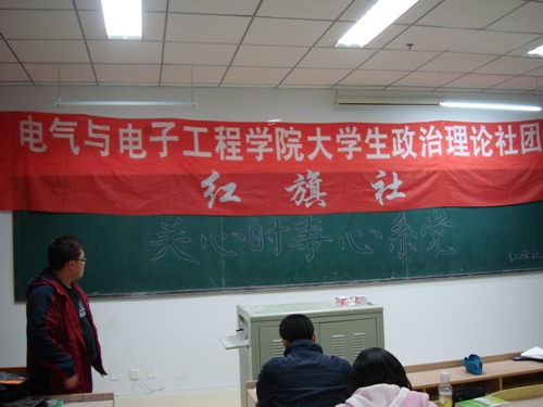为认真贯彻落实党的十七届三中全会精神及我校开展深入学习实践科学发展观活动的指导思想,我院红旗社于2008年11月21日晚6:30,在教学科研楼307教室举行了“关心时事,心系党”为主题的党基本理论知识竞赛。 学院党总支高度重视,希望通过本次活动促使新生同学们在刚踏入大学的校门就能切身体会到党的教育,了解党的基本知识、路线和方针。红旗社认真搜集了近一段时间国家发生的重大事件配合我党的主要方针政策刊印成复习资料分发给08级红旗社新社员们。社员们仔细研读了复习资料,认真准备。整个竞赛环环相扣,内容丰富,给红旗社社员们上了一堂生动的“关心时事,心系党”教育课。 通过本次竞赛,提高了同学们关注时事的热情。同学们提高了对党的认识,也把学理论、争先进、重发展的学习热潮带给身边的每位同学。