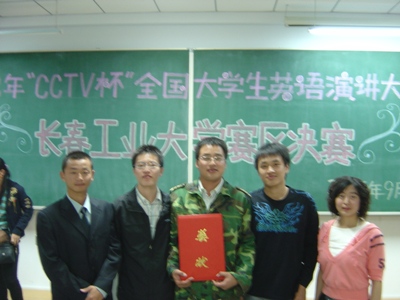 9月24日晚6点,2008年“CCTV”杯全国大学生英语演讲比赛长春工业大学赛区决赛,在南湖校区教学科研楼301教室拉开帷幕,21名选手经过初选成功闯入决赛,选手们高超的英语水平,稳定的心理素质,机智的现场对答,征服了全场观众,我院四名选手刘明鸿,刘乙和,高嵩,王坤都在决赛中表现出色。其中高嵩、王坤取得三等奖的好成绩,我院也凭着优异的组织协调能力获得集体组织一等奖。
